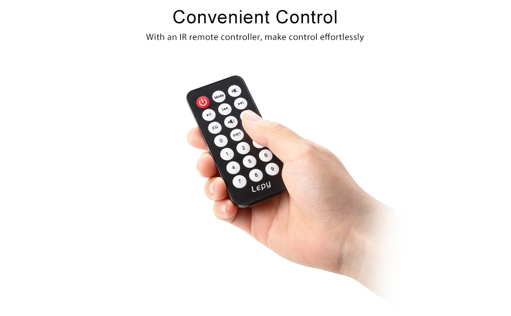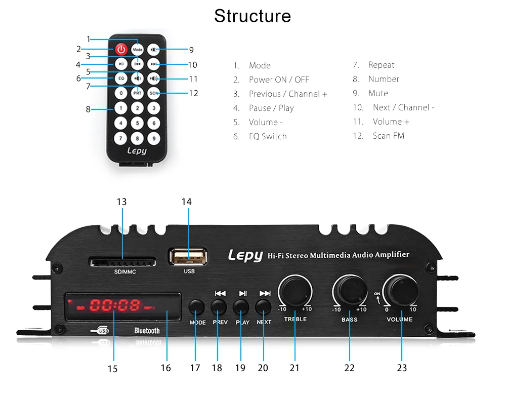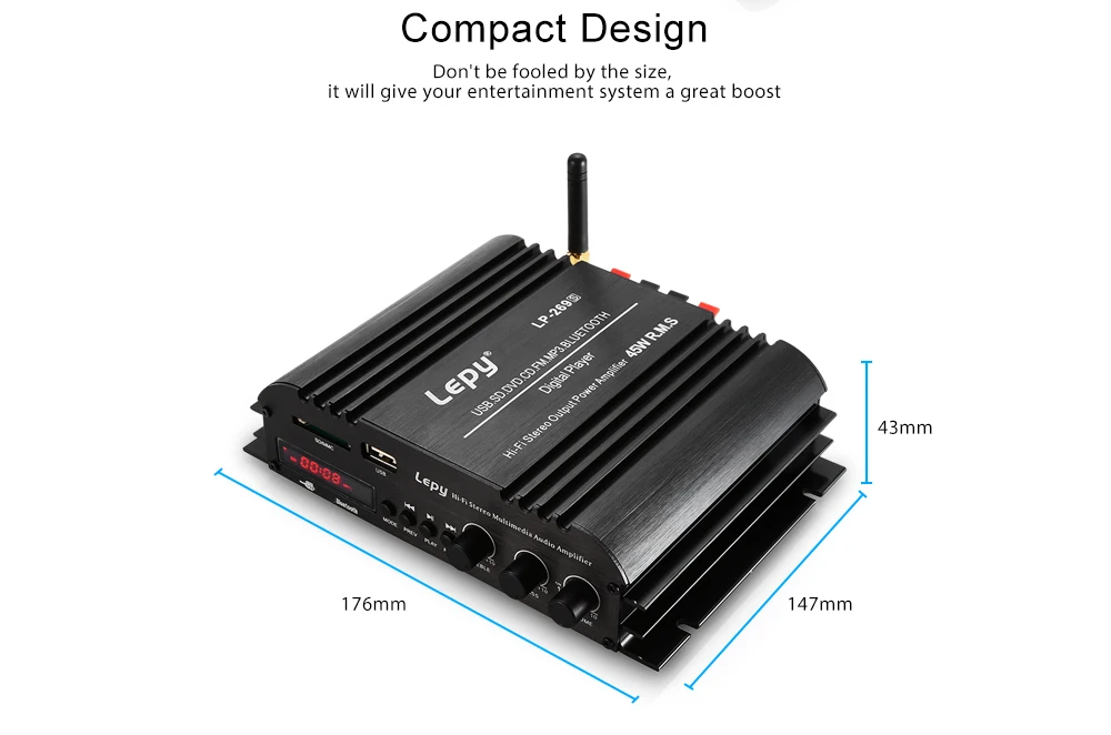 Package Contents 1 x Lepy LP - 269S Bluetooth Amplifier, 1 x Power Adapter, 1 x Power Cable, 1 x FM Cable, 1 x Remote Controller, 1 x English User Manual