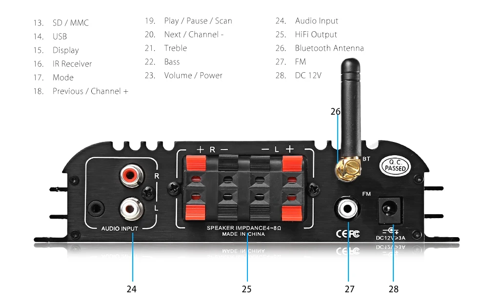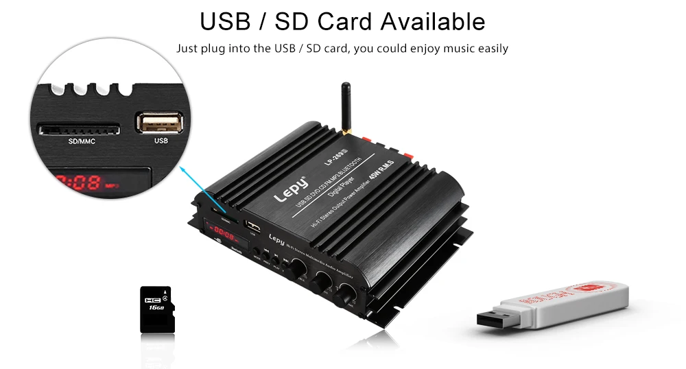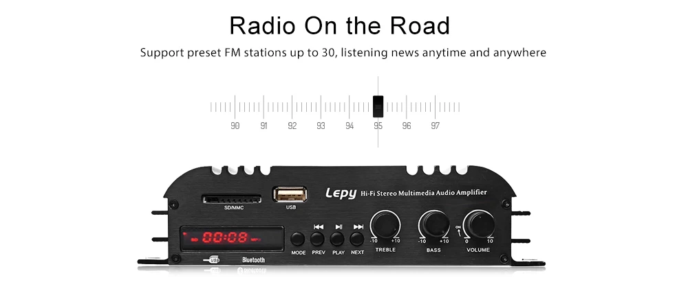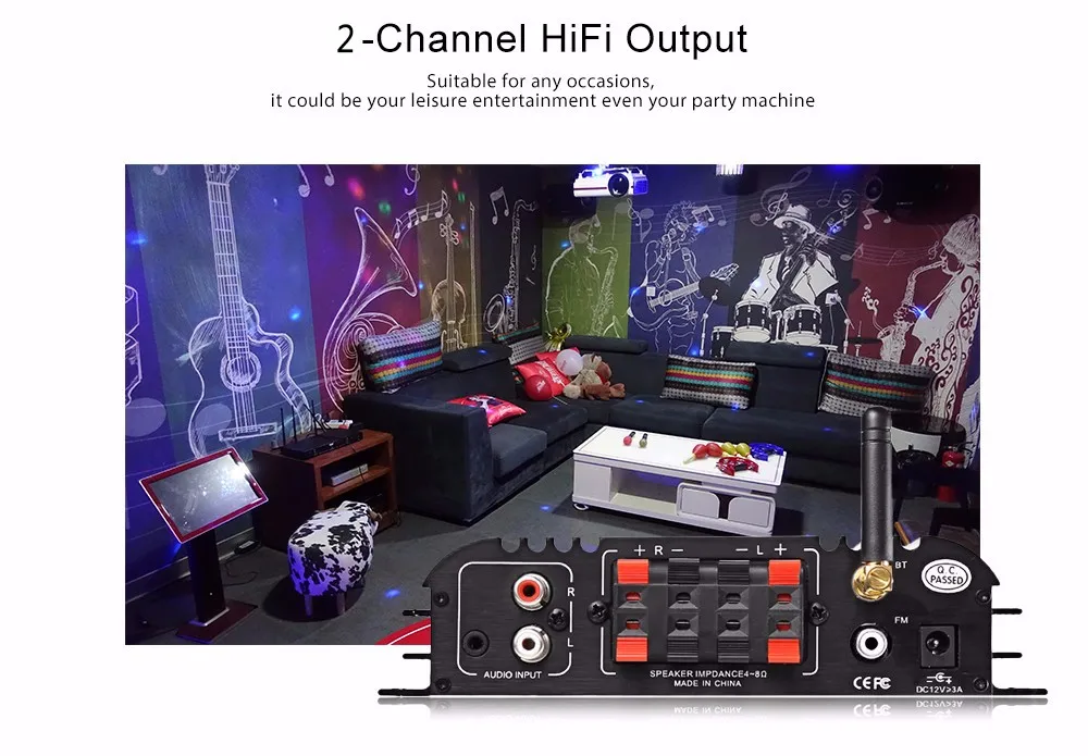 As long as your music or files are located in your storage device, the amplifier will read the MP3 files directly. And LED bright illuminated display could show the playing status, real-time operation of the music easily