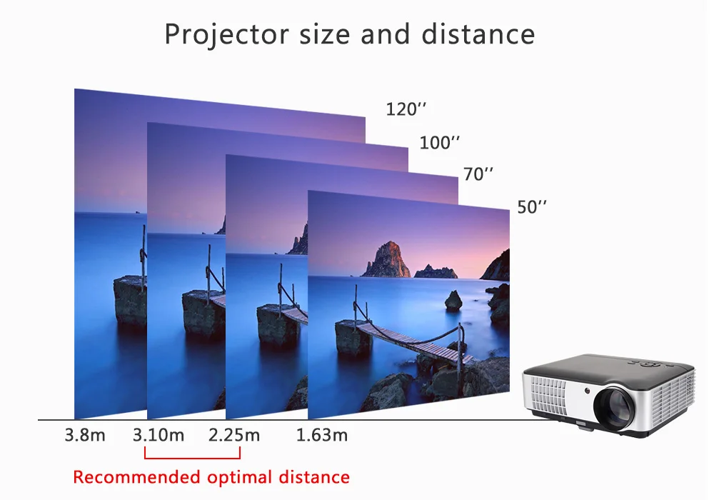 The best projection distance is about 2-4m with projection size of 50-120 inches which can make you enjoy best watching experience.
